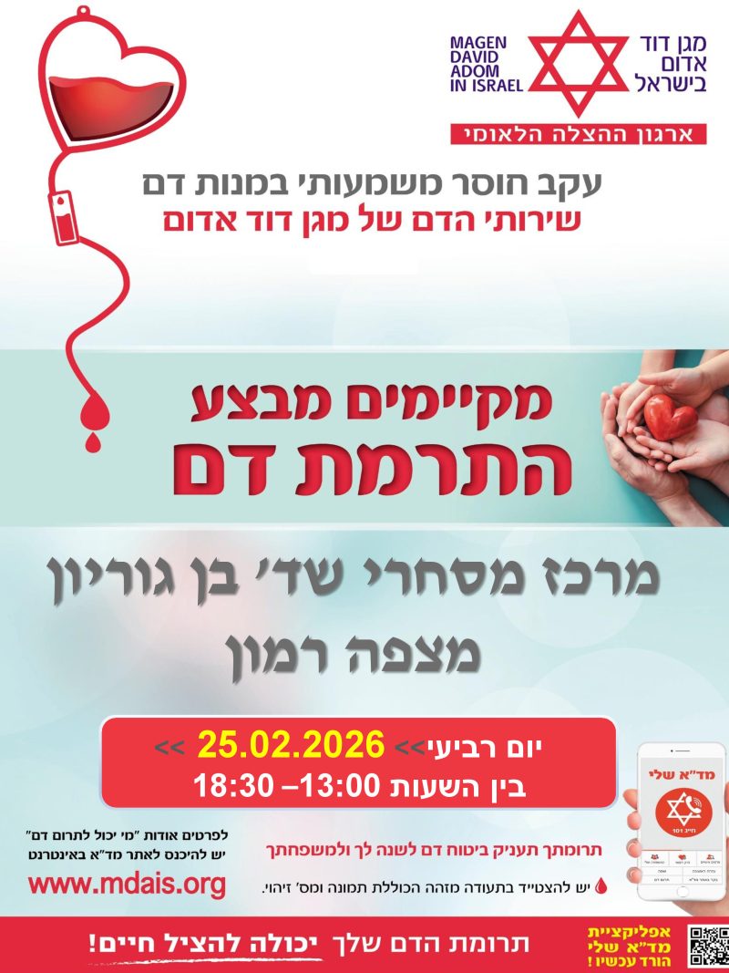 התרמת דם במרכז המסחרי 26.2.26 שתף תושבות ותושבים יקרים, מוזמנים להגיע ביום רביעי 26.2.26 בין השעות 13:00-18:30 ברחבת המרכז המסחרי
