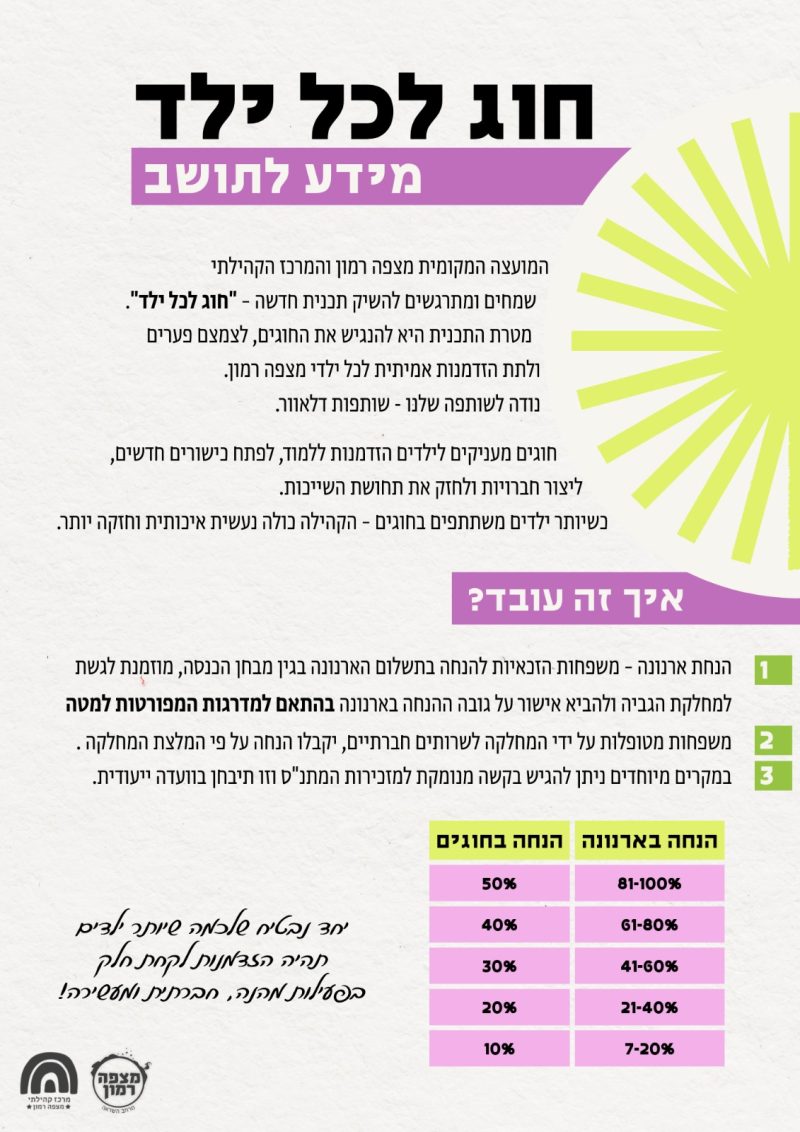 המאפשרת לכל ילד/ה לבחור ולהשתתף בחוג איכותי במתנ”ס בעלות מסובסדת (בהתאם לעמידה בקריטריונים).