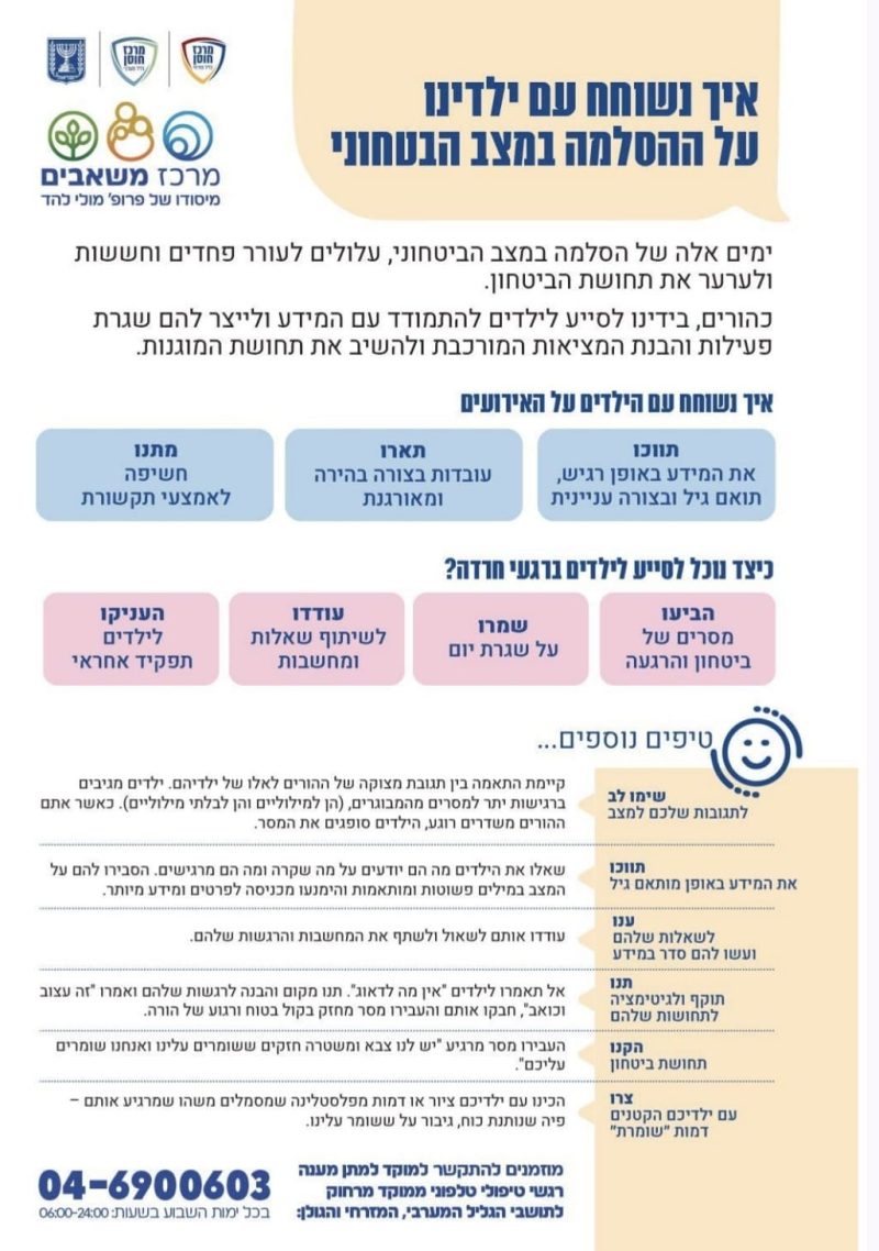 בשעות אלו של מתיחות וחוסר ודאות, גם הורים וגם ילדים עשויים לחוות דאגה, לחץ או בלבול, לעתים גם חוויות של הצפה או ניתוק.